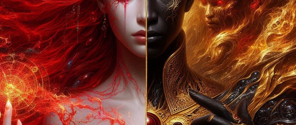 Their clashing energies created a maelstrom of power that drew all eyes. Gold and crimson light spiraled around them in a deadly dance, each strike sending shockwaves that shattered the ground beneath their feet. Lesser demons caught in the crossfire found themselves either transmuted to gold or rendered to shadow, their screams adding to the cacophony of battle.