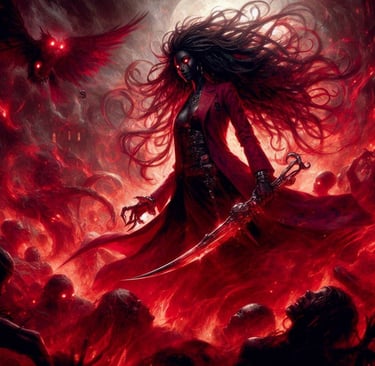 Shadows danced across the battlefield, each flicker a testament to the chaos unfolding beneath Hell's crimson sky. Decarabia moved through the tumult like a whisper, her footsteps leaving no trace in the scorched earth. The clash of steel and screams of the fallen created a symphony of destruction around her, but her focus remained singular: Marbas.