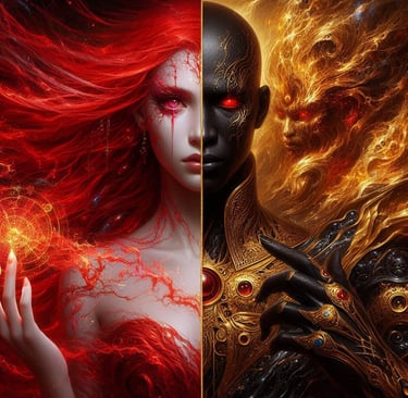 Their movements mirrored each other, two predators sizing up their prey. Every step Azazella took left traces of crimson shadow, while Kozor's footfalls turned the ground to molten gold. Lesser battles raged around them, but none dared venture too close—even the most battle-crazed demons recognized the lethal dance unfolding before them.