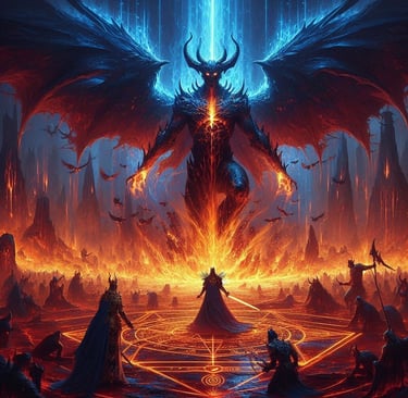 Lucifer's presence filled the space between heartbeats, his authority absolute. "The terms of our alliance are non-negotiable. Submit, or forfeit everything." Blue flames danced around him, casting shadows that seemed to reach for Mammon's soul.