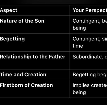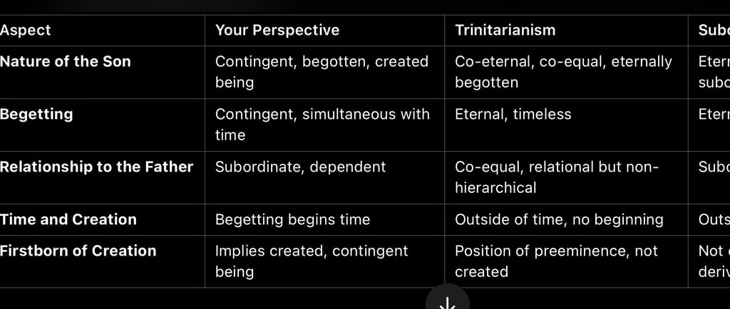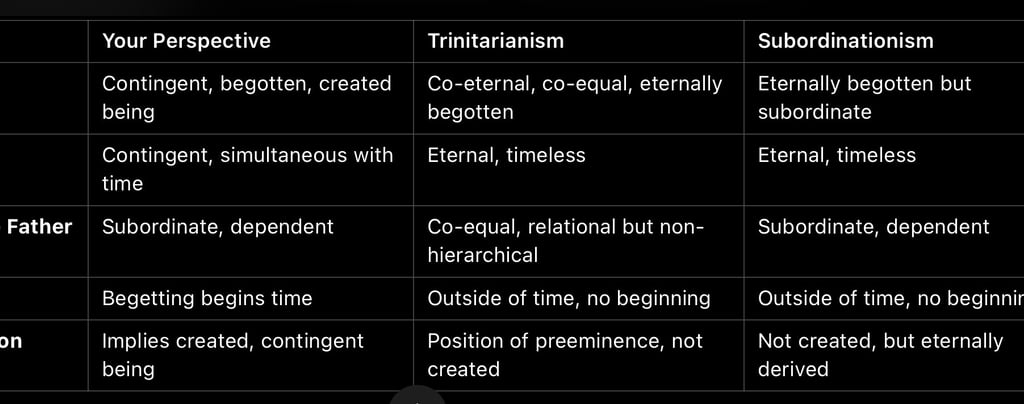 My position affirms that the Son is a contingent, begotten being, whose generation coincides with the beginning of time. Unlike Trinitarianism, which removes contingency from the Son’s existence, and Subordinationism, which struggled to articulate the Son’s eternal generation, my view provides a coherent explanation rooted in Scripture, reason, and early church writings. The Son is divine, of the same kind as the Father, yet subordinate and contingent, marking Him as the firstborn of all creation and the unique expression of the Father’s nature.